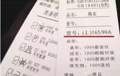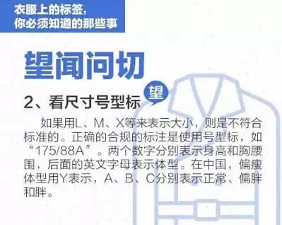 合规的标注是使用号型标,如“175/88A”。两个数字分别表示身高和胸腰围,后面的英文字母表示体型。在中国, A表示“正常”、B表示“偏胖”、C表示“胖”,Y表示“偏瘦”。