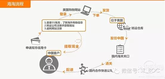 商品转运流程:转运快递网站注册->境外网站购物->境外网站发送至转运快递->转运快递发到国内->快递到手中