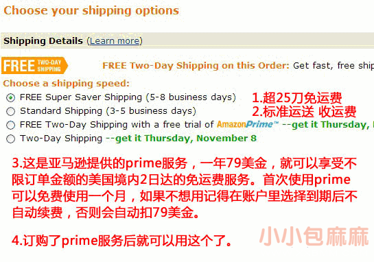 接下来就是选择运送方式,一般情况下如果你订单超过25美金,就勾选第一项满25美金就免运费的Super Saver Shipping免运费服务,系统提示的是5-8个工作日送达,但一般情况下五天就肯定能到了。如果订单没超过25美金的话是要收取运费的,通常情况下你可以选择凑单来达到25美元,因为运费也够买几件小商品了。这里要特别说一下第三项:Prime免运费服务!