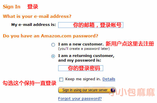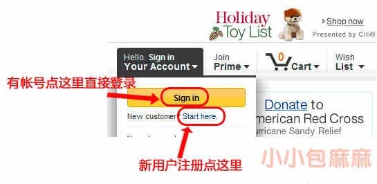 打开亚马逊(www.amazon.com)后,点击页面右上角的“sign in”进行注册或登录。现在就注册。