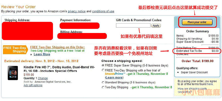 此外这里要审核的是这笔订单是否出现了消费税,如果到最后结账那一步显示有消费税,那么你先不要付款,把地址换成上面的OR或DE免税州地址就可以了。都没有问题后,点击“Place your order”就算下单完成了。出现“Thank you”的页面即表示付款成功,你只要耐心等待货物发到转运仓库就行了。在此期间你可以在账户的“tracked your packages”中跟踪包裹的运送状态。