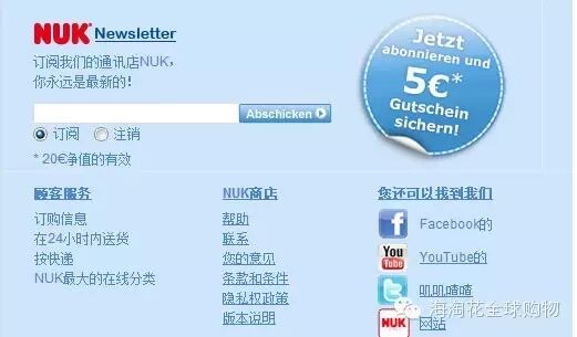 1、进商店http://www.nuk-shop.de/ 拉到最下方,最下角有个注册送5欧的优惠券,填写邮箱地址。