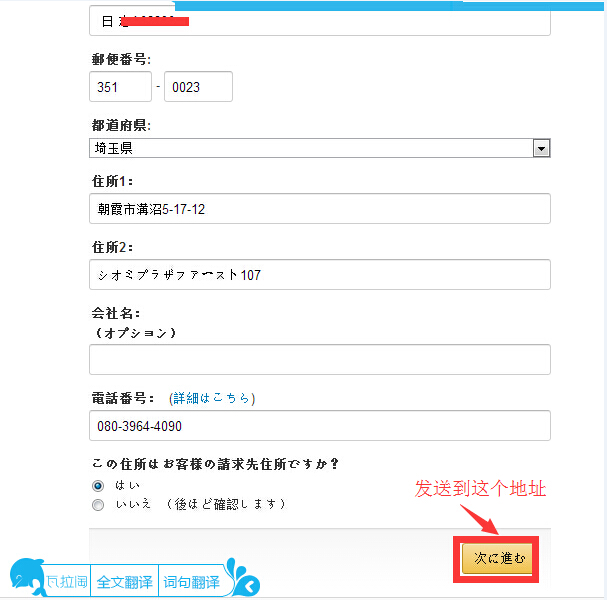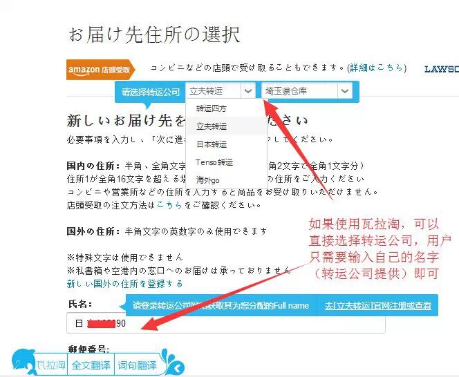 登陆账号之后就会跳转到填写配送地址页面,此处页面可以切换到中文,这里可以参考立夫转运官网提供的日本亚马逊的示例,同样,使用这个瓦拉淘,可以自动填写,只需要填写个名字就行,这个是转运公司给的唯一识别码,千万不能搞错了。
