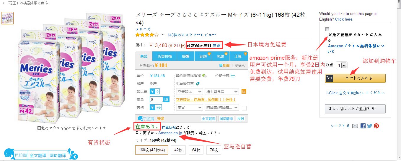 有几个关键词需要注意,如“通常配送無料”意为“免邮费(日本境内)”,“在庫あり”意为“有货”