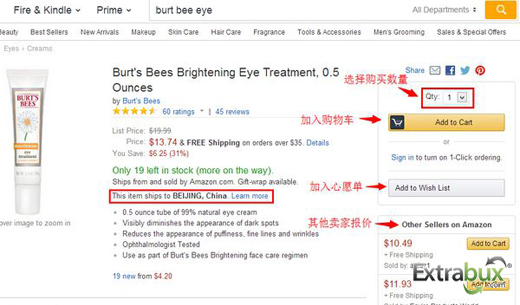 找寻您心仪的商品,带有“This item ships to BEIJING,China”字样表示您选购的商品支持直邮中国。选好后,点击GO TO CART去结算。
