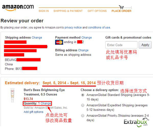由于已设置了收货地址和支付信息,结算后进入Review your order的步骤,在预览订单的页面可以看到Shipping address收货地址、Payment method支付信息、Gift cards & promotional codes填写礼品卡或优惠码。