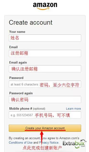 来到www.amazon.com,点击右上角Your Account下的“Start here”即可进入注册新账户。