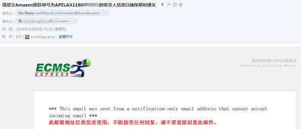 还有一个要注意的!美亚直邮中国的货物,有几个承运公司,有的承运公司(比如ECMS)会给你发一封中文邮件,说需要你提交一些信息,清关用,如下图。其中,需要上传身份证的正反面复印件照片(我会加个水印“仅供清关用”)。注意收这封邮件和及时填写哈。
