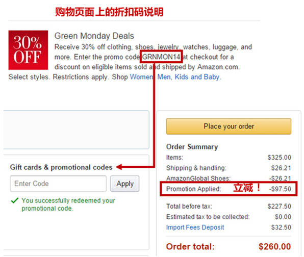 再注意一点,重点哦。老外喜欢折扣码,经常各种活动有各种折扣码,在商品页面或者活动页面会提示一个折扣码,到checkout的页面再填,填了就可能得到15%~30%不等的折扣,不填就没有哦~