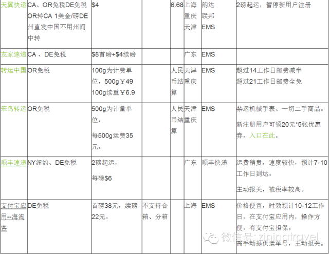 10、斑马物流 11、QQ华人快递 12、天翼快递 13、友家速递 14、转运中国 15、笨鸟转运 16、顺丰转运 17、海淘客(支付宝)