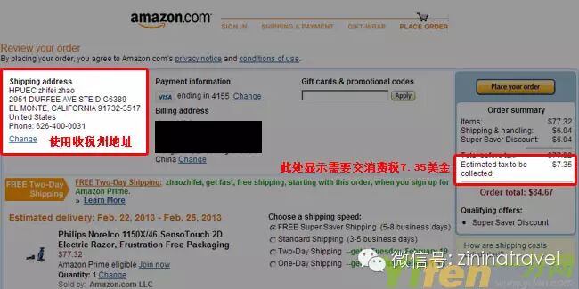 CA(California加州)和NJ(NewJersey新泽西州)、TX(TEXAS德克萨斯州)这三个州的地址是可能会收取消费税的,具体要看你是在哪个购物网站上消费,以及你消费的是什么商品,如果觉得没有头绪,建议你购物时,优先填写CA和NJ、TX的地址,如果到最后结账那一步显示有消费税,那么你先不要付款,把地址换成上面的OR或DE免税州地址就可以了。