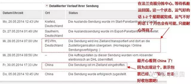 点击“Detaillierter Verlauf Ihrer Sendung”后出来的详细信息:(以一个到达的单子为例说明)