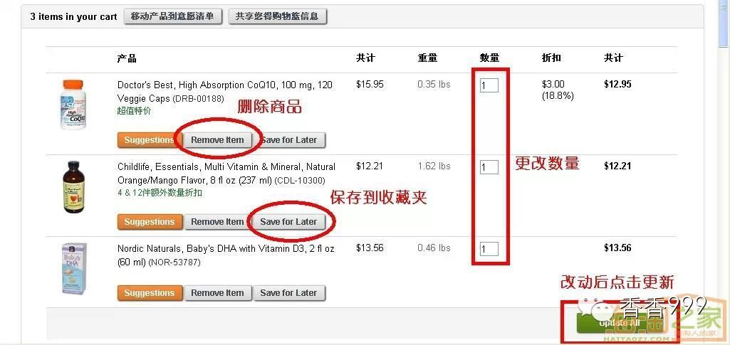 用上述的方法,找到所需的其他产品,全部加入购物车,产品的数量可以更改,如下图:7