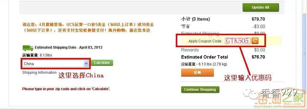 运输重量下拉菜单选中China,点击Caculate,计算出相应的运费。在图示红色方框内输入优惠码GTK505,点击右边的更新按钮