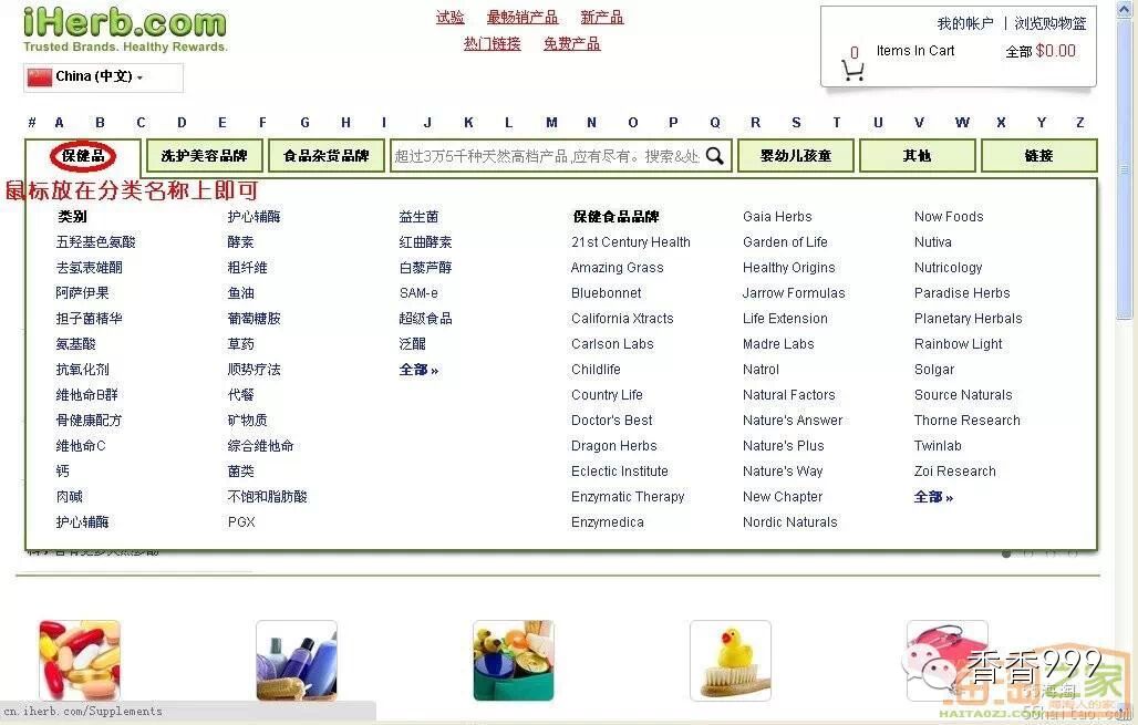 1、打开: http://www.iherb.com/IHERB首页,打开时是英文的,点击左上角下拉选择 China(中文)就会切换到中文界面。(或者点此链接直接打开中文页面)