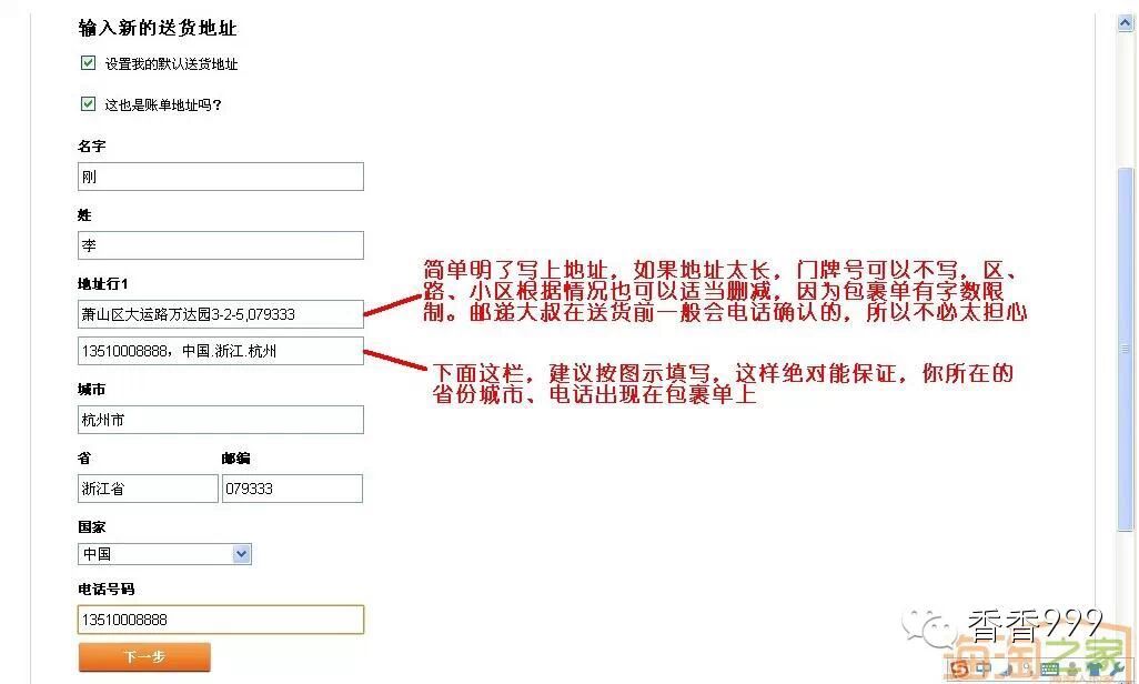 地址这里填写一定要用中文,尽量精简准确,只要省、市、区、邮编正确,就一定能收到。至于街、小区、门牌号可以适当删减,因为如果文字太多,包裹邮寄单不能全部显示,反而容易把最重要的信息丢掉。况且按我的经验邮递再送货前一半是会电话确认的,所以基本不用担心送错的问题.