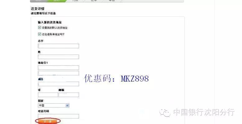 5.加入购物车后点击EDIT CART&CHECKOUT(及结账),进入结账环节,这里可是享受优惠的重要环节哦,第一次购物的顾客可以填写优惠码:MKZ898 你的首次购物满40美金就可减10美金的优惠,不满40美金可减5美金,满60美金还有5%的折扣。