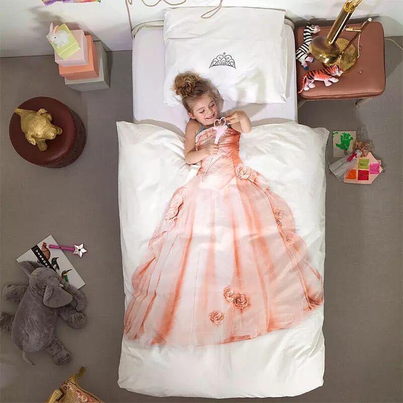 枕头上的小皇冠搭配被单上一袭粉嫩蓬裙礼服,连睡觉也美美的!
